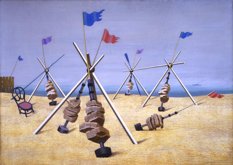 About MeWhen Edward Wadsworth learnt of Aberdeen Art Gallery's intention to purchase this picture in 1938 he wrote to express his pleasure, since much of his childhood had been spent in Mintlaw, Aberdeenshire. It was in Peterhead that Wadsworth gained his first knowledge of the sea and coastal subjects feature strongly in his art. When this picture was painted Wadsworth had abandoned abstraction for a new heightened realism in which nature and the surreal came together in frozen ghostly silence. There is an element of fantasy in this work, derived from unexpected juxtapositions of scale and calculated precision. An absence of human interest further adds to the unnatural and surreal quality of the work.