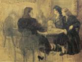 About MeJim Lovegrove trained at the Royal College of Art in London after serving with the army during World War II. He struggled to support himself as an artist and began working for a living in other, more stable professions. He returned to art in 1991, exhibiting on a number of occasions before his death.This work depicts three women around a table in a café. The women seem tense and appear to be waiting for someone. The muted colours add to the slightly downbeat tone, but Lovegrove applies them with an attention to texture and form, particularly in the curls of the women's hair. There are lines still visible on the work where it has been squared up. This indicates that it is probably a study for a larger work as the artist would have used the squares to transfer the image onto another surface.