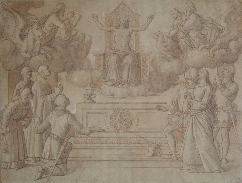 A study for a fresco in the Queen's Robing Room at Westminster showing Christ "in Majesty" flanked by the evangelists with Sir Galahad, chosen to receive the Holy Grail, fallen to his knees