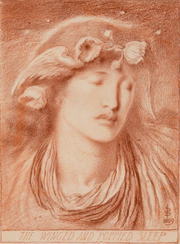 About MeSimeon Solomon was both an artist and a poet. In 1871 he published the prose poem, 'A Vision of Love Revealed in Sleep'. 'The Winged and Poppied Sleep' is one of many drawings in which he returns to this poetic theme. The figure who personifies Sleep wears a garland of poppies which from classical times were the flowers associated with sleep and death (and as the source of opium, may also allude to the use of opiate drugs which was then prevalent). Solomon was a close associate of the poet Swinburne and in 1893 he may have met Verlaine, who autographed the frame of this drawing.