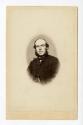 About MeCarte de visite of a man taken portrait style with a vignette. He is wearing a white shirt and black tie with matching a jacket and has a distinctive beard and side burns. He is also wearing a waistcoat and a pocket watch chain in visible. c.1860-1870c. 1870