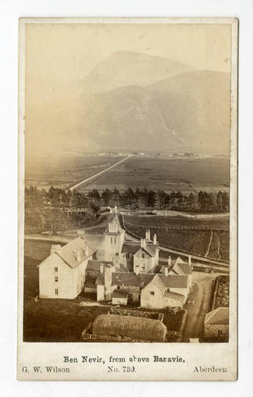 About MeCarte de visite of Ben Nevis from above Banavie, a small village outside of Fort William in the Highlands. A cluster of houses are visible in the foreground along with a line of trees and a vast open landscape leading up to Ben Nevis. On the reverse side there is a date hand-written in ink: 1870. Also there is a note in pencil: 'Sep 70' and a stamp which reads: 'T. . Stackhouse.' g.w.wilson no.730 aberdeen
