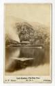About MeCarte de visite of the boat pier at Loch Katrine in the Trossachs. There is a hilly forest-scape with a long steam-boat visible on the water.George Washington Wilson and Company