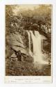 About MeCarte de visite of Inversnaid Falls in Loch Lomond. A man can be seen on the left walking towards the water's edge, possibly William Gellie. There is also a bridge visible high up above the falls. George Washington Wilson and Company