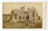About MeCarte de Visite of Melrose Abbey from the south-west. It is a partly ruined monstery founded in 1136 and once belonged to the Cistercian order in Melrose, Roxburghshire. It was the chief house of the Cistercian order until the Reformation. There is a man sitting in the grass among the gravestones with a book in his hand and he appears to be wearing a beret. g.w.wilson no.97 aberdeen"