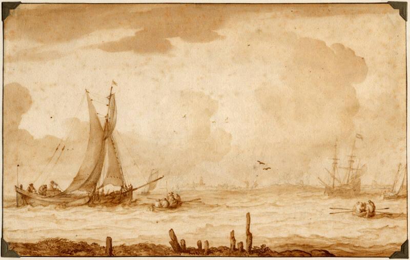 About MeAllart van Everdingen was born in Alkmaar in the Netherlands in 1621 and studied in Haarlem before settling in Amsterdam in 1657. River and sea scenes were recurrent themes in Everdingen's works, inspired by his hometown which was a port, and the several trips to Norway that he took during his lifetime.The seventeenth century is considered by historians to be 'the golden age' of the Netherlands, particularly with regard to its growth as a trading power. Here, Everdingen uses a wash technique to capture the busy river, rough waters and billowing clouds in the skyline. He uses ink to render accurately the details - the rigging on the ships, the shoreline and the figures - to give a sense of the bustling Netherlandish port.