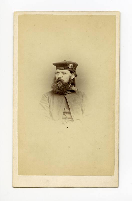 About MeCarte de viste portrait of George Washinton Wilson wearing a glengarry bonnet. Washington Wilson reportedly used a similar bonnet as a lens cap.