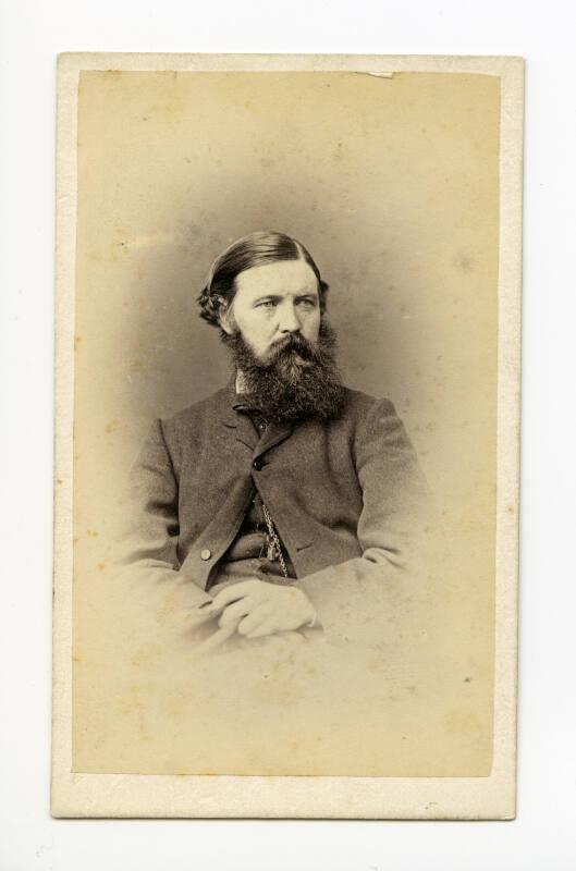 About MeCarte de viste head and shoulders portrait of George Washington Wilson. He is sitting with his hands crossed in his lap. His hair has a left parting and he has a full beard. There is a visible pocket watch chain on his waistcoat.1858-1878
