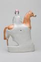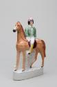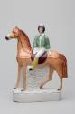 The successful jockey Fred Archer is depicted seated on a large horse. This ornament has a flat back so that it can be displayed on a mantlepiece.