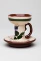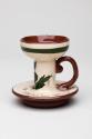About MeThis candlestick is an example of motto wares which became popular in the early and mid 20th century as holiday souvenirs. The red earthenware body is covered with cream slip and has a painted thistle design and the motto 'Guid nicht an joy be wi ye' has been scratched into the slip, revealing the red clay beneath. In spite of its Scottish subject matter the candlestick was manufactured in Devon by the Longpark Pottery Co. Motto ware was the principal commodity produced by this Torquay company. These small souvenir type wares featured naïve patterns of cottages and other shapes and wares intended for Ireland bore a shamrock whilst those for Scotland featured a thistle. The company was in existence between 1903 and 1957.