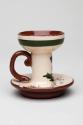 About MeThis candlestick is an example of motto wares which became popular in the early and mid 20th century as holiday souvenirs. The red earthenware body is covered with cream slip and has a painted thistle design and the motto 'Guid nicht an joy be wi ye' has been scratched into the slip, revealing the red clay beneath. In spite of its Scottish subject matter the candlestick was manufactured in Devon by the Longpark Pottery Co. Motto ware was the principal commodity produced by this Torquay company. These small souvenir type wares featured naïve patterns of cottages and other shapes and wares intended for Ireland bore a shamrock whilst those for Scotland featured a thistle. The company was in existence between 1903 and 1957.
