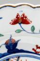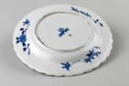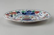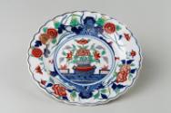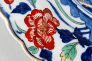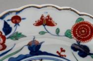 This plate has a scalloped fluted edge and is decorated with underglaze blue and iron red enamel. The pattern around the edge lacks symmetry and looks a bit chaotic.