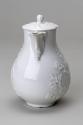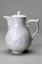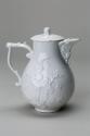 About MePorcelain blanc de chine milk jug with moulded prunus blossom on a pear-shaped body with shield-shaped handle.