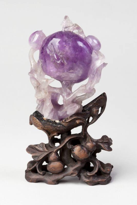 About MeChinese carved amethystine quarts peach surrounded with foliage and sitting on a carved wooden stand.