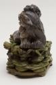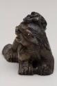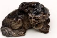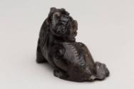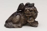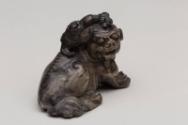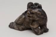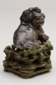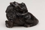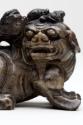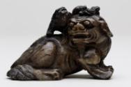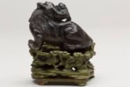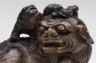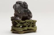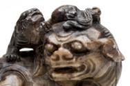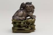 About MeChinese small carved blackish soapstone Fu Lion Dog or chimera with a miniature lion or dragon on its head. The dog is sitting on a carved wooden stand which has been stained a green colour.