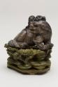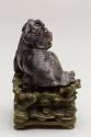About MeChinese small carved blackish soapstone Fu Lion Dog or chimera with a miniature lion or dragon on its head. The dog is sitting on a carved wooden stand which has been stained a green colour.