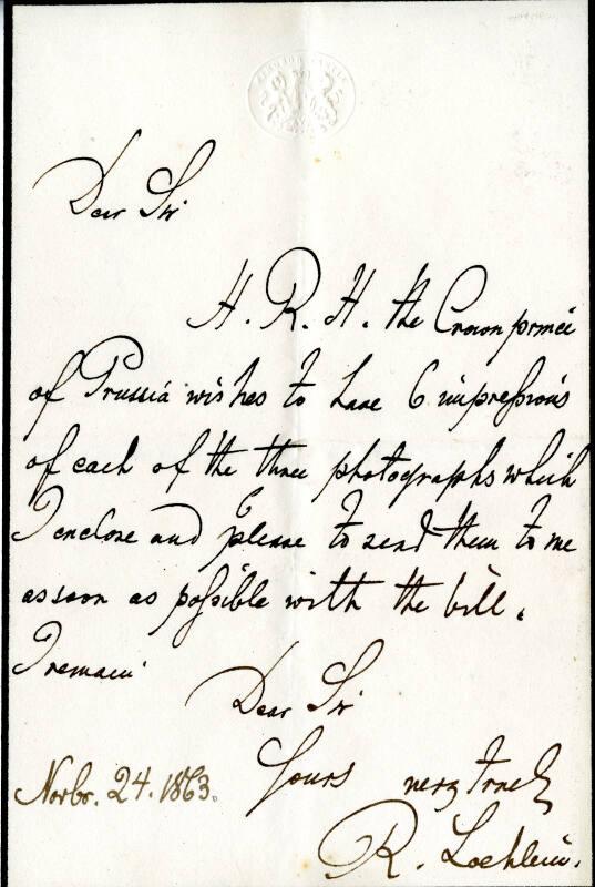 After the death of Prince Albert in 1861, Wilson's photographs of the Queen and the Royal family were quite the opposite of those taken previously. After this date the portraits arranged by the Queen were set up as tributes to Prince Albert. The portraits of Prince Frederick William and his family were the last informal portraits of the Queen and the Royal Family that Wilson produced. They were requested by the Queen for the family album.