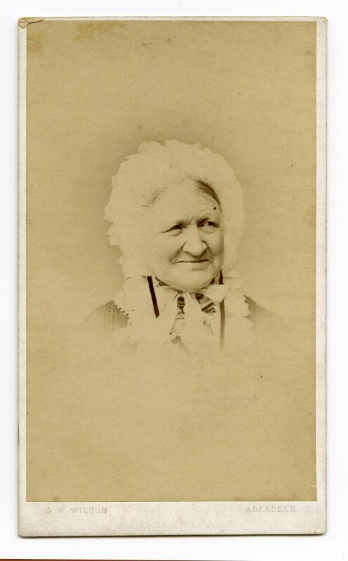 About MeCarte de visite portrait, possibly of Ann Carmichael Wilson, sister of G. W. Wilson; Inscribed in ink on back: "i remember her when i went to say goodbye as i was going to boarding school (convent) in the south of england in 1911. Great Aunt Anne died aged 95 yrs"