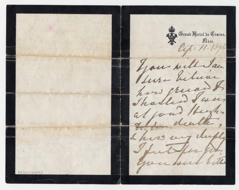 Letter of condolence sent by Queen Victoria to the widow of Hughe Brown, who like his older brother John, was a royal servant