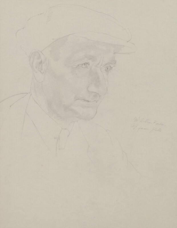 Spencer, as an official War Artist, was sent to record shipbuilders on the Clyde, producing a series of monumental paintings of heroic figures. This pencil sketch in contrast is realistic and unassuming.