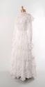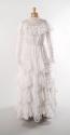 About MeMrs Louise Robertson wore this flounced nylon dress to her wedding at Ferryhill Parish Church, on Fonthill Road, Aberdeen, in 1986.This full-length white nylon wedding dress with hat boasts a plethora of frills around the bodice, sleeves and skirt. These grand details were accompanied by a grand silhouette, with the skirt underpinned by several petticoats. In the 1980s, the most popular dresses were romantic and feminine, and although based on a traditional style, were often made of synthetic, modern materials like nylon and polyester.