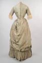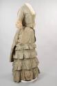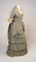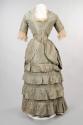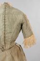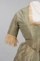 Lighter colours were often used for eveningwear as a departure from the darker more practical fabrics used for daywear. This two-piece evening dress made from a fine green striped silk is typical of the period. The bodice is a fitted v-shape with a square neckline and ¾ length sleeves. The skirt features an apron front and layers to give it volume, while there is padding at the back to form a slight bustle.