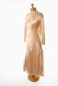 About MeThis pink wedding dress features a very fashionable bias cut that flows into a big hem. It was worn by an Aberdeen bride for her wedding at St Machar's Cathedral in 1934.During the 1930s, fashion became highly influenced by the cinema. Wedding dresses were either romantic, influenced by the historical styles featured in the movies, or plainer, evening-dress style dresses with intricate bias cuts, like this one. The bias cut was popular for accentuating body-lines and creating more fluid curves and softer drapes.