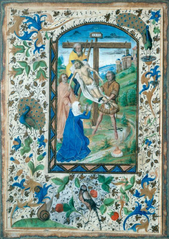 This scene is set within an arched window with an elaborately decorated border around the outside. Two men take Christ down from the cross, while Mary kneels below. She is wearing blue, which symbolises heaven and is comforted by St. John. The action appears to be set in a contemporary landscape, with a castle in the background. The artist has rendered the small details of objects and expressions with great care. The border contains foliage, fruit and peacocks, which were symbols of immortality and the resurrection.