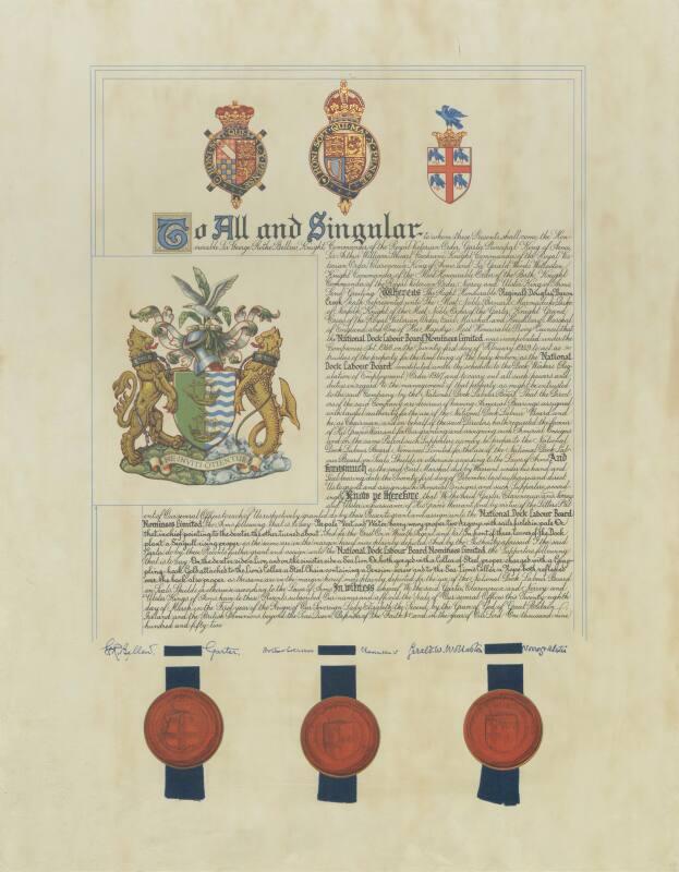 Framed Certificate giving the National Dock Labour Board a Set of Armorial Bearings