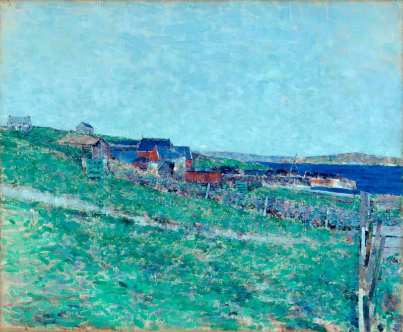 About MeJohn Quinton Pringle is today seen as one of the most idiosyncratic and original artists to emerge from Scotland in the early years of the 20th century. His distinctive work is rare and highly collectable. Living in Glasgow, Pringle usually painted the urban scene but occasionally he also painted in the countryside. Pringle made at least two trips in Shetland, where he stayed with his friend, a doctor named W.G. Wilson, on the island of Whalsey. This is a fine example of Pringle's unique style, with heightened but tonally similar palette and thin glazes of paint diluted with turpentine and applied with short square brushstrokes. The overall effect is one of shimmering surface pattern, reminiscent of Seurat or Signac.