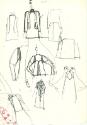 About MeMultidrawing of various sketched dresses with some outlines which look like smock tops or short dresses.The most prominent design on the front of the drawing is a front view of a minidress with a high neck and curving seam lines over the front, which form a pattern. A head wearing a cap is sketched in red biro in the lower left corner.