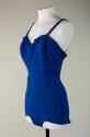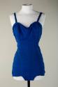 About MeThis ladies blue cotton bathing costume has a sweetheart neckline and boned bodice. The back is smocked and there are horizontal lines of white elastic visible on the interior.