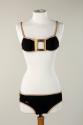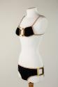 There is a large gold-coloured metal square on the right hip, left hip and centre of the bust. Similar metal decoration appeared on other bikinis made by Nelbarden in the 1970s.