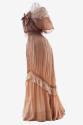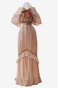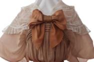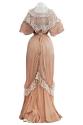 This exquisite dress shows some of the techniques used to enhance the bust and upper body area. Horizontal ridged trimming across the bosom adds fullness while the lace collar gives the effect of broadening the shoulders. The dress is balanced by the addition of lace trimming near the bottom of the skirt