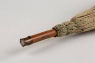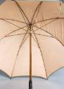 The brown wooden stick is attached to eight stretchers that are in turn attached to eight metal ribs and the wooden spike has a metal ferrule.