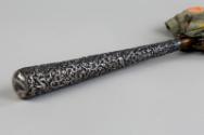 The unmarked silver tapering or billiard cue handle has peacocks, other birds, flowers and foliage carved in relief.