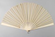 Manmade lady's fan with eighteen sticks decorated simply with dots and leaves supporting a plain fabric mount