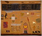 The translation into tapestry echoes the colours, quality and feel of the artist's original design, in this case a playful scattering of objects against a textured background.