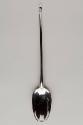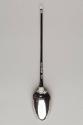 Masking spoons were used for stirring the tea in the pot and unblocking the tea leaves from the spout. This piece illustrates a typical masking spoon form, with a long, narrow stem and pointed finial, shaped to fit up the spout.