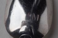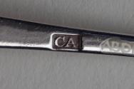 Masking spoons were used for stirring the tea in the pot and unblocking the tea leaves from the spout. This piece illustrates a typical masking spoon form, with a long, narrow stem and pointed finial, shaped to fit up the spout.