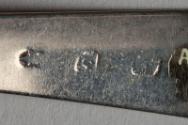 About MeOne of a set with round oval bowl, rectangular mouldnap, square wedged shaft and fiddle pattern handle.