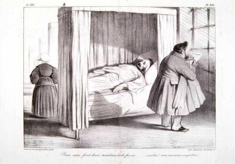 Daumier mocks King Louis Philippe, here portrayed after an 1834 rebellion against him, as an insensitive doctor calling a dying rebel "a strapping lad".