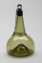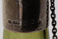 About MeGreen glass bottle decanter with silver mounted ring, chain, collar and stopper, with crescent shaped finial.The green glass bottle has a Russian stamp dated 1815.