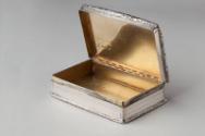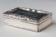 About MeRectangular box with applied engraved scrolling foliate border around edge of lid and base. Also applied plain plate on hinged lid; embossed diamond and feather pattern on base and sides.1846 - 1847