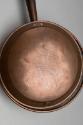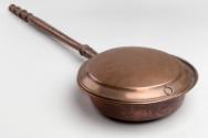 About MeCopper bedwarming pan with turned wooden pole handle and a decorative round copper pan. The lid of the pan has been decorated with a punched design featuring a peacock style bird perched on a floral branch.c.1830