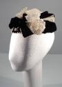 About MeLadies white net lace skull cap with black velvet and pearl trim. The net lace and black velvet are stitch to a peak shaped white net cap stiffened with wire.1870 - 1890