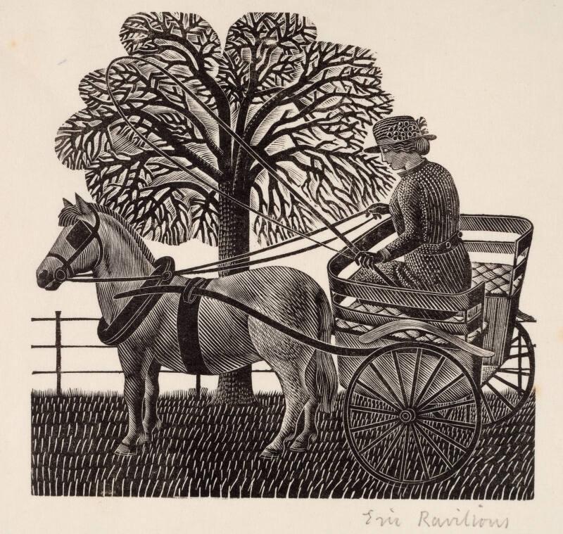 About MeRavilious made this illustration 'Miss Creed of Little Bardfield' for a Christmas card for the Redfern Gallery.In his engraved illustrations Ravilious showed a preference for the type of subject matter which was to appear throughout his work, a countryside in which gentle mystery, charm and security are enjoyed by a human populace which he treats like decorative symbols.