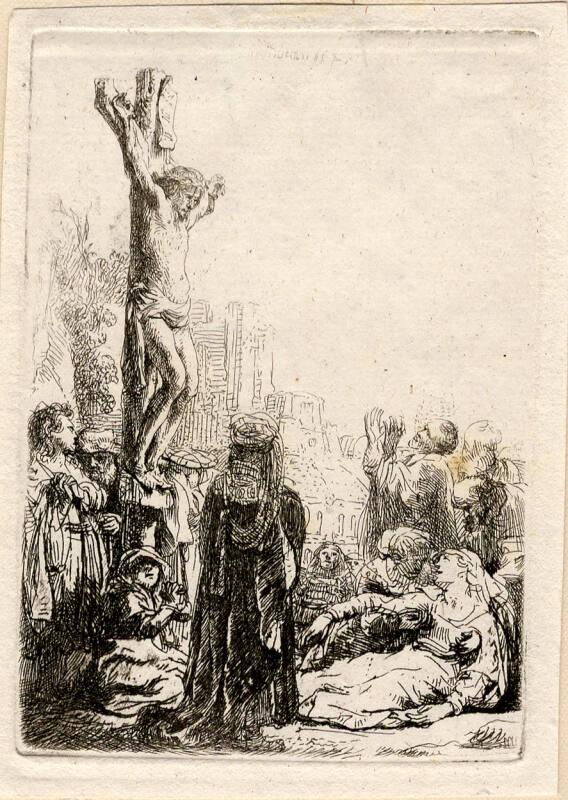 About MeThis print was probably made in the 18th century, using Rembrandt's original plate. Frenchman Claude-Henri Watelet acquired over 70 of the plates around 1760 and ‘restored’ many of them. After his death plates passed to print dealer Piere-François Basan .Known as ‘The Crucifixion: small plate’ to distinguish it from Rembrandt's other images of this subject, the composition breaks with the usual symmetrical arrangement. The cross is placed off-centre and at an angle, focusing attention on the significant characters. Rembrandt pays particular attention to the features and emotion conveyed in the faces of the figures surrounding Christ.