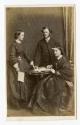 About MeCarte de visite of a a man and two women (from left to right): the first woman is pictured standing with a book in her right hand and her left resting on a table with books, papers and pens. She is wearing a dress with a white collar, long sleeves and white cuffs with buttons going down the length of her bodice. Her hair is styled above her shoulders in a middle parting and she appears to be wearing a bracelet on her right wrist. She also has a brooch pinned to her collar as well as one on her belt. The man is also standing, his hair is neatly styled, combed down the right side. He is wearing a matching suit and jacket with a white shirt and patterned necktie. A pocketwatch chain is visible inside his waistcoat, a handkerchief is inside his left breast pocket and he appears to be wearing necklace of some kind with a ring attached to it/ or a monacle (?) The second woman is sitting down at the table with a pen in her right hand; her dress has a white collar and long sleeves with black lace trim on the cuffs. Her hair is styled in plaits woven just above the neck and she is wearing earrings and a shawl. Photographer's full print details can be seen on reverse side. c.1860s