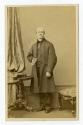 About MeCarte de visite of a man standing inbetween an ornate table and chair with a book in his right hand. He is wearing a pair of glasses and is wearing a long coat with an upturned collar. He has a rounded white collar, a dark waistcoat where a pocketwatch chain can be seen, and matching trousers. He is possibly a cleric? There is also some writing on the photograph in pen, but this can only be seen with a magnifying glass- see just by the table leg and across from his right shin: '188 (or 3) 2 D.' Photographer's full print details can be seen on reverse side. c.1860s